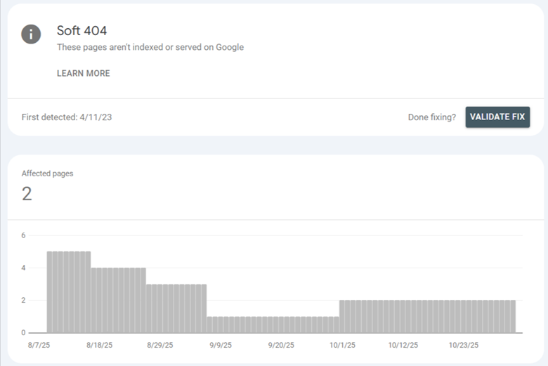 • What It Means: Your server returns a "200 OK" success status (meaning the page loaded technically), but the page itself is empty, has very little content, or looks like an error page. Google interprets this as a "soft" 404.